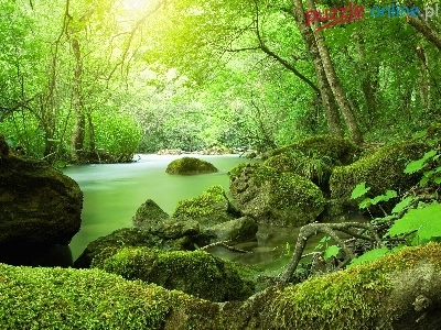 Kamienie, Zieleń, Rzeka, Drzewa, Mech