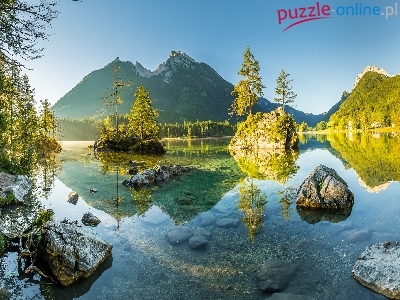 Bawaria, Skały, Drzewa, Jezioro Hintersee, Niemcy, Góry Alpy, Kamienie