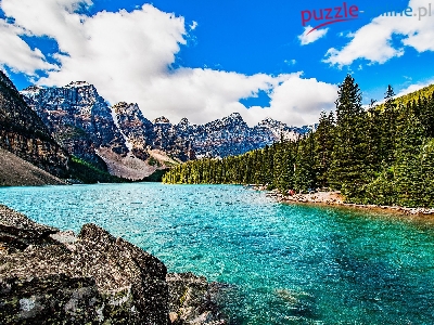 Kamienie, Jezioro, Chmury, Góry, Las, Skały