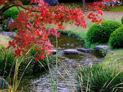 Kamienie, Rzeka, Trawy, Jesień, Liście, Krzewy