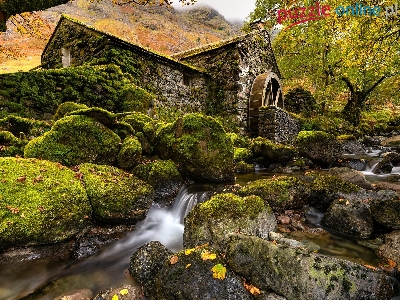 Kamienie, Drzewa, Młyn wodny, Rzeka, Jesień, Kumbria, Anglia, Omszałe, Borrowdale
