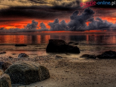 Kamienie, Słońca, Morze, Plaża, Zachód