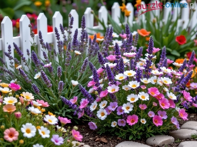 Puzzle Płot, Kolorowe, Kwiaty, Kamienie