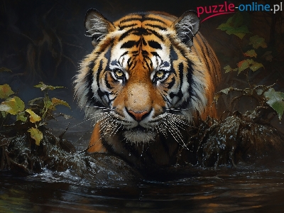 Tygrys, Kamienie, Rośliny, Grafika, Woda