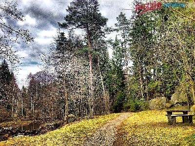 Kamienie, Ławka, Las, Rzeczka, Dróżka