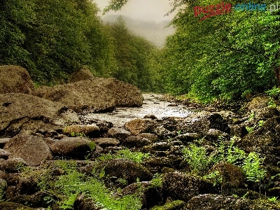 Kamienie, Mgła, Las, Rzeka, Paprocie
