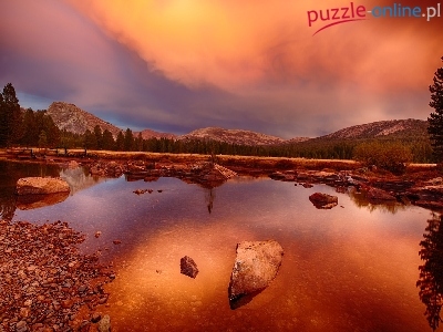 Puzzle Kamienie, Zachód Słońca, Rzeka, Góry