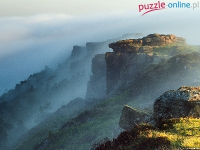 Kamienie, Drzewa, Góry, Skały, Mgła