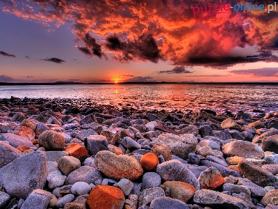 Kamienie, Chmury, Zachód, Słońca, Morze