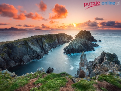 Kamienie, Zachód słońca, Chmury, Skały, Morze, Trawa, Wybrzeże, Niebo