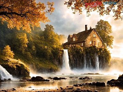 Kamienie, Jesień, Niebo, Chmury, Dom, Wzgórze, Las, Rzeka, Wodospady, Drzewa