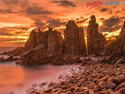 Wyspa Phillip Island, Zachód słońca, Kamienie, Morze, Australia, Przylądek Cape Woolamai, Skały