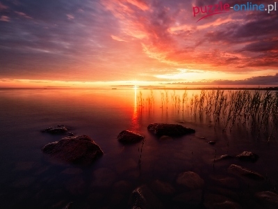 Puzzle Kamienie, Jezioro, Trawa, Zachód słońca