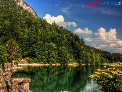 Kamienna, Kwiaty, Jezioro, Drzewa, Balustrada