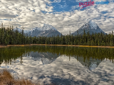 Odbicie, Jezioro, Góry, Lake Reflections, Brązowa, Park Narodowy Jasper, Kanada, Drzewa, Trawa