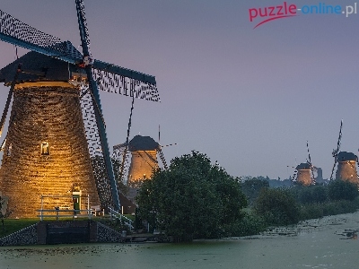 Puzzle Kanał, Oświetlone, Wiatraki, Zmrok