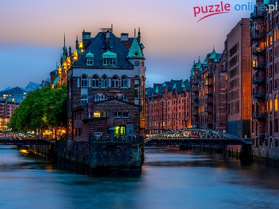 Kanały, Hamburg, Niemcy, Speicherstadt, Mosty, Drzewa, Zmierzch, Budynki, Światła