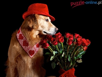 Puzzle Kapelusz, Piesek, Bukiet Czerwonych Róż