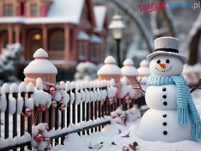 Kapelusz, Bałwan, Zima, Niebieski, Ogrodzenie, Śnieg, Grafika, Szal, Bombki