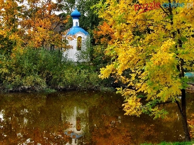 Puzzle Kapliczka, Rzeka, Drzewa, Jesień