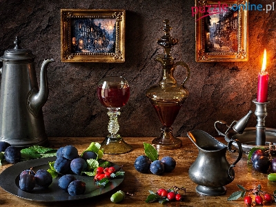 Śliwki, Jarzębina, Świeca, Dzbanek, Obrazy, Wino, Kompozycja, Karafka