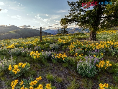 Kwiaty, Columbia River Gorge, Rezerwat przyrody, Góry Kaskadowe, Balsamorhiza, Stan Oregon, Stany Zjednoczone, Łąka, Drzewo