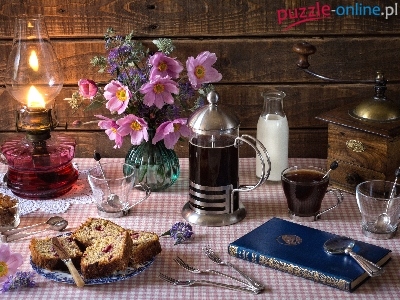 Zawilce, Kawa, Książka, Bukiet, Lampa, Kompozycja, Flakon, Młynek