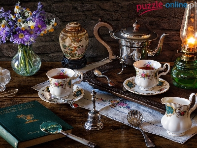 Kompozycja, Lampa naftowa, Bukiet kwiatów, Czajnik, Serwis kawowy