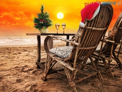Plaża, Kieliszki, Zachód słońca, Fotele, Świątecznie, Morze, Choinka