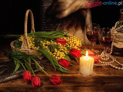 Koszyk, Kieliszki, Wino, Åšwieca, Butelka, Tulipany, Naszyjnik, Kadarka