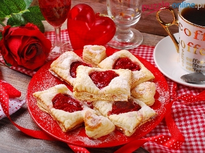 Marmolada, Kieliszki, Walentynki, Róża, Ciasteczka, Kawa, Stół
