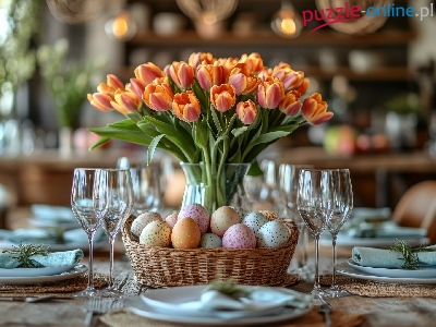 Koszyczek, Wielkanoc, Tulipany, Kieliszki, Wielkanocny, Stół, Pisanki
