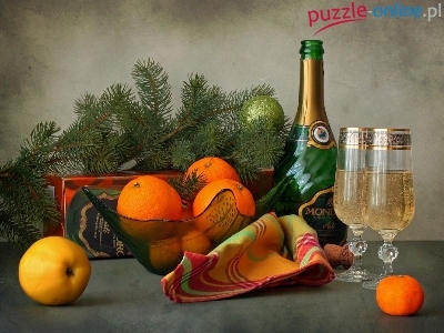 Jodły, Cytrusowe, Szampan, Owoce, Gałązka, Kieliszki, Pomarańcza