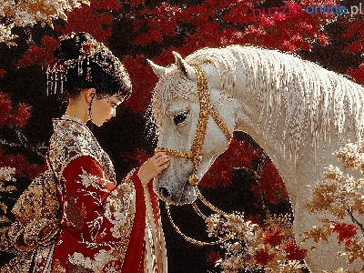 Japonka, Kimono, Dziewczyna, Koń, Biały