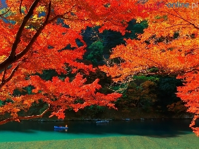 Jesieni, Lasy, Wyspa, Góry, Japonia, Łódka, Kolory, Jezioro, Drzewa, Kioto