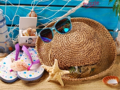 Lato, Klapki, Wakacje, Okulary, Kompozycja, Kapelusz, Muszelki