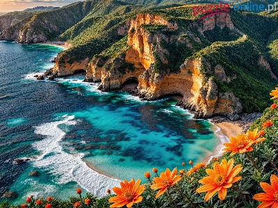 Wybrzeże, Klif, Kwiaty, Grafika, Morze