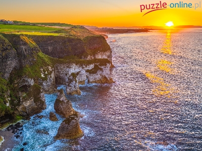 Klif, Irlandia Północna, Wybrzeże, Skały, Morze, Hrabstwo Antrim, Zachód słońca