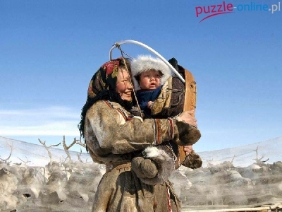 Puzzle Kobieta, Eskimos, Dziecko, Renifery