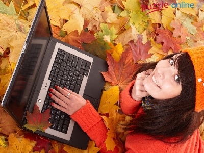 Puzzle Kobieta, Jesień, Liście, Laptop