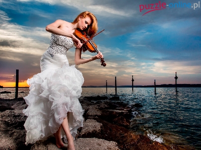 Puzzle Kobieta, Morze, Skały, Skrzypce