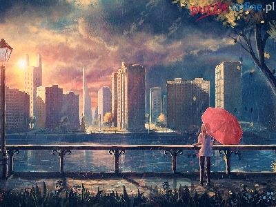 Kobieta, Miasto, Woda, Obraz, Wieżowce, Parasol