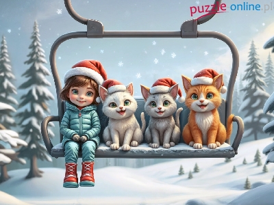 Kolejka linowa, Śnieg, Koty, Las, Ośnieżone, Dziewczynka, Zima, Drzewa