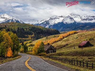 Drzewa, Droga, Pola, Stany Zjednoczone, Wilson Peak, Kolorado, Domki, Telluride, Jesień, Ogrodzenie, Chmury, Wzgórza, Góry