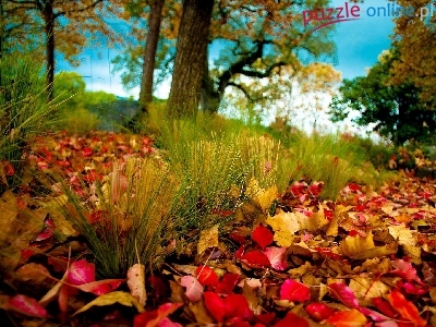 Puzzle Kolorowe, Drzewa, Łąka, Liście