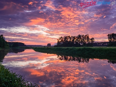 Trawa, Rzeka, Odbicie, Polska, Chmury, Narew, Kolorowe, Drzewa, Zachód słońca, Niebo
