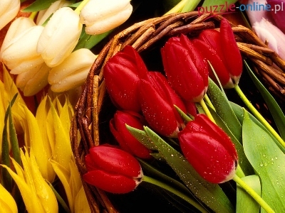 Puzzle Kolorowe, Wiklinowy, Kosz, Tulipany