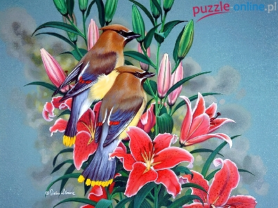 Puzzle Kolorowe, Czerwone, Lilie, Ptaki