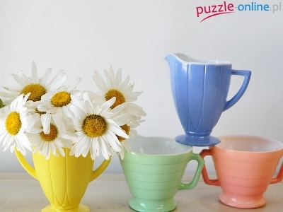 Puzzle Kolorowe, Białe, Margerytki, Filiżanki