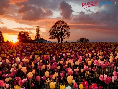 Puzzle Kolorowe, Zachód, Słońca, Tulipany